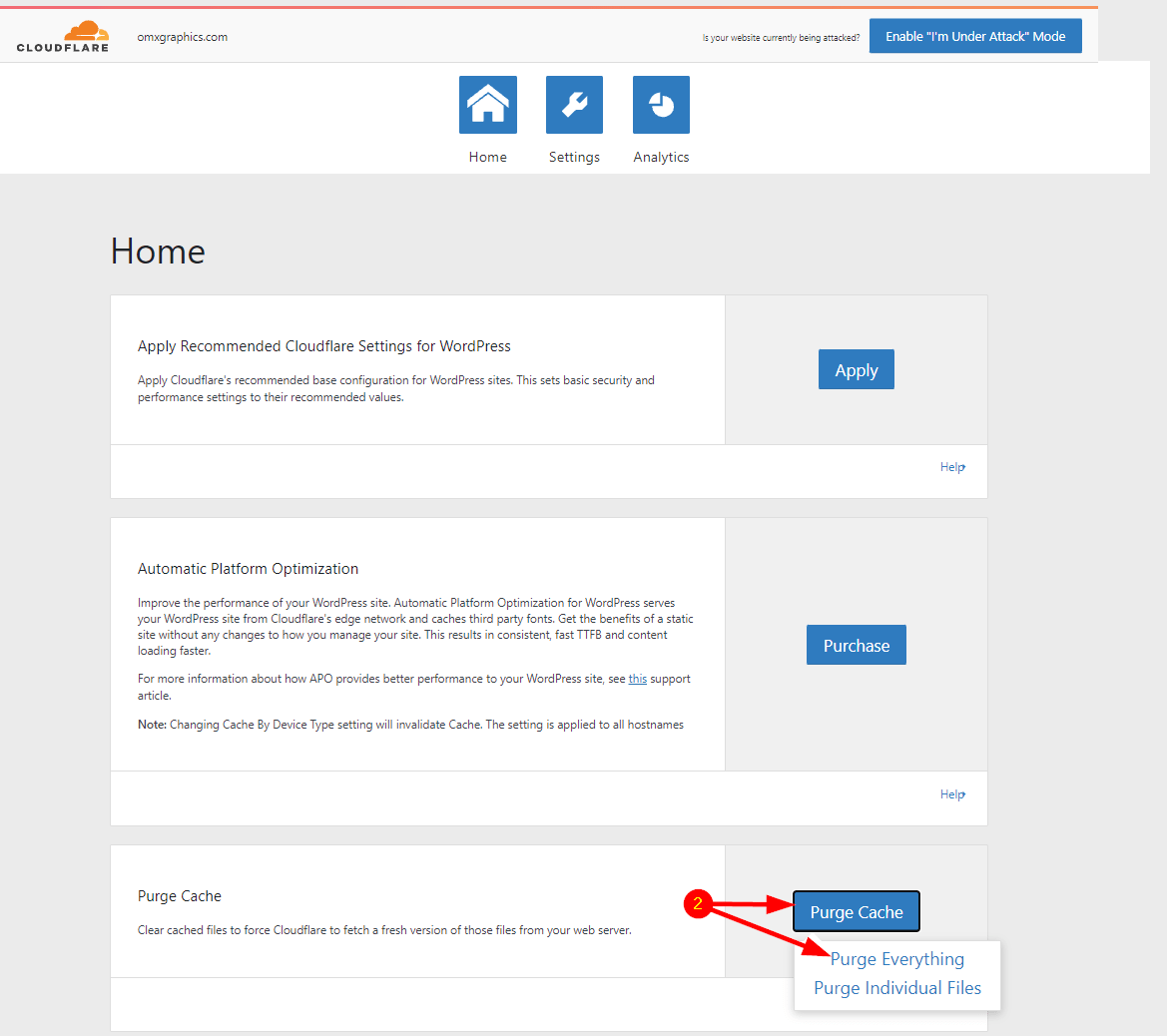 2. Then you can clear the Cloudflare cache by opening this page and click on these buttons:
