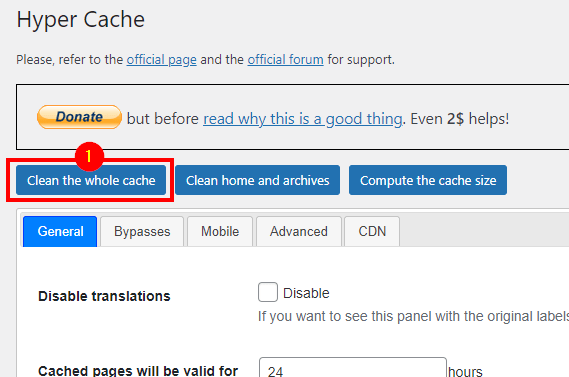 1. First you need to clear the website server cache; for that please go to this page and click the « Clear the whole cache » button: