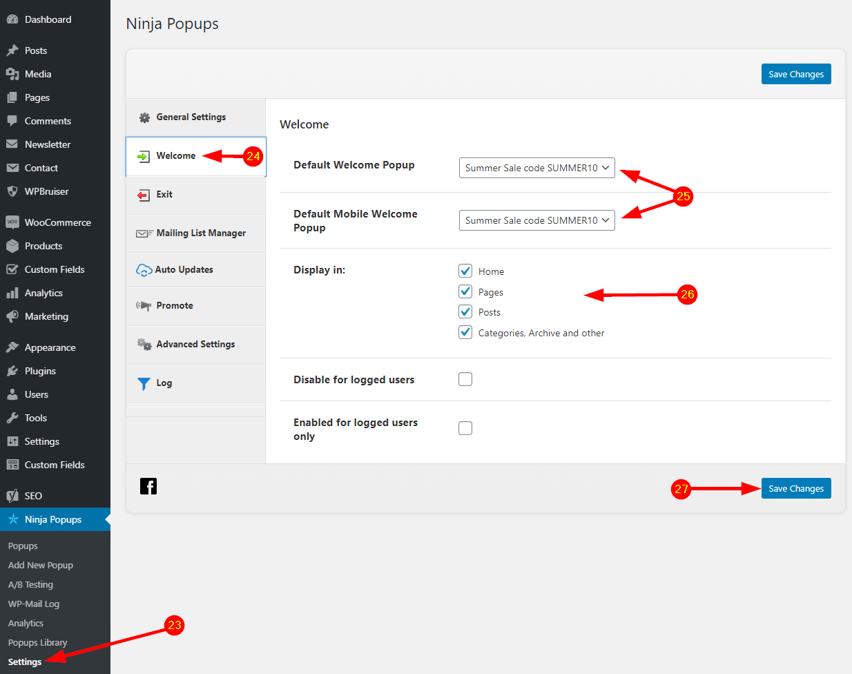 25. Select the newly created popup as Default Welcome Popup for desktop and/or mobiles (otherwise it will not appear in front end!)