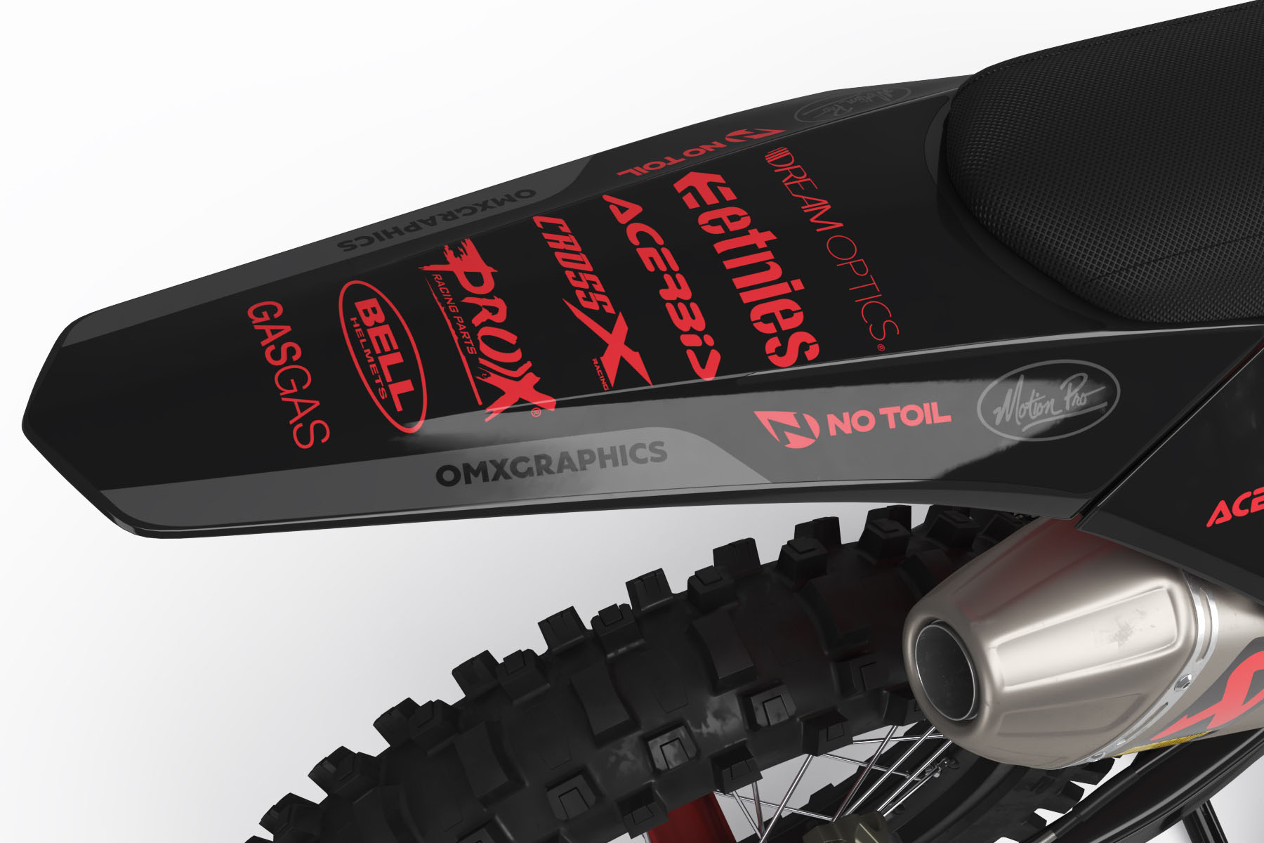 Ce design personnalisé est disponible pour la plupart des modèles GasGas à partir de 1998. Choisis ton modèle dans la liste ou saisis-le manuellement. Tu peux changer les couleurs, ajouter des logos, ton nom et ton numéro – sans aucun coût supplémentaire! Indique simplement tes détails de personnalisation ci-dessous et nous t’enverrons un aperçu du design par e-mail pour validation.
