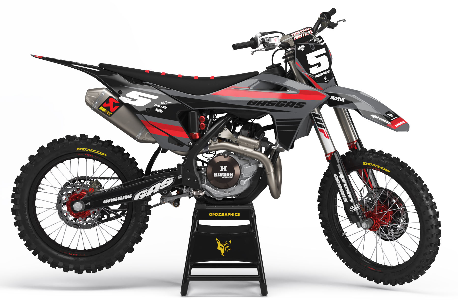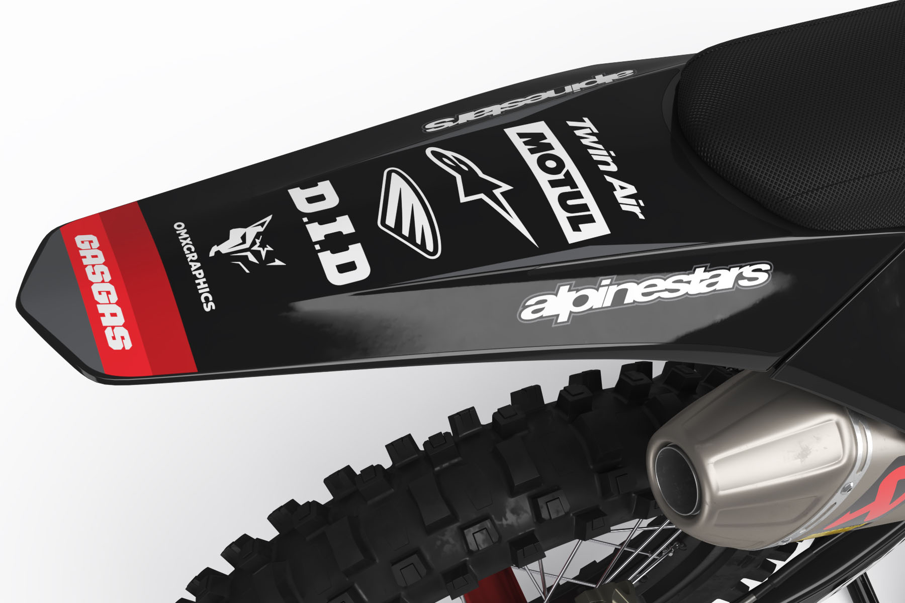 Ce design personnalisé est disponible pour la plupart des modèles GasGas à partir de 1998. Choisis ton modèle dans la liste ou saisis-le manuellement. Tu peux changer les couleurs, ajouter des logos, ton nom et ton numéro – sans aucun coût supplémentaire! Indique simplement tes détails de personnalisation ci-dessous et nous t’enverrons un aperçu du design par e-mail pour validation.
