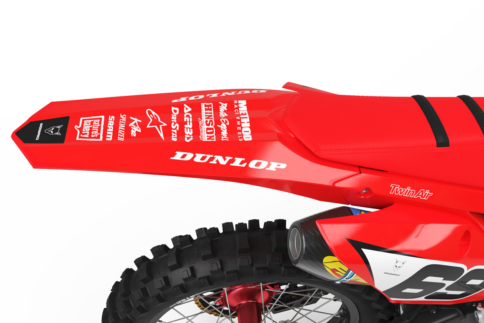 Ce design personnalisé est disponible pour la plupart des modèles Honda à partir de 1998. Sélectionne ton modèle dans la liste ou saisis-le manuellement. Tu peux changer les couleurs, ajouter des logos, ton nom et ton numéro – sans frais supplémentaires! Il te suffit d’indiquer tes personnalisations ci-dessous, et nous t’enverrons un aperçu du design par e-mail pour validation.