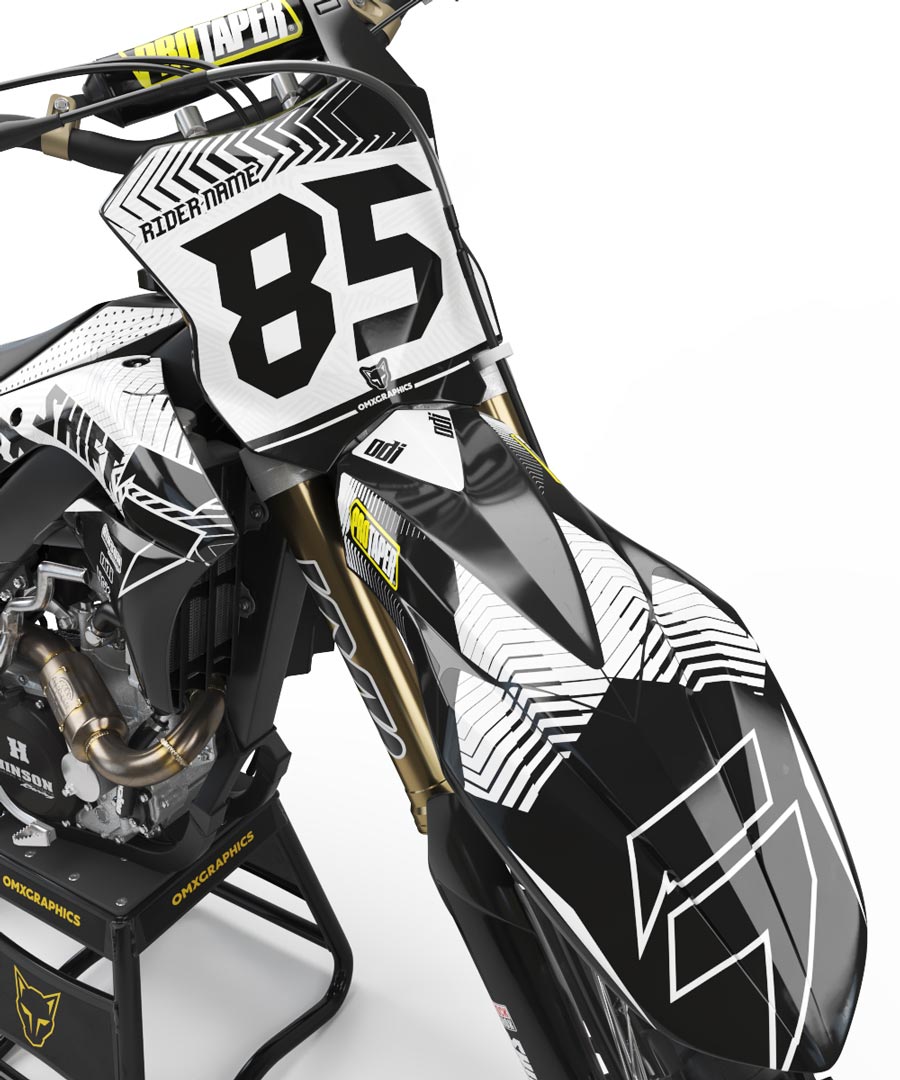 All of our custom graphic kits can be made to fit any make and model! If you don’t find your bike / model on our website, feel free to drop a line and we will figure it out for you! Full graphics kit includes: Radiator shroud set Front and side number plate decals Air box decals Front fender decal Rear fender decal Fork guard decals Swing arm decals Logos: We have most of Motocross industry related logos that can be used on your decals; However there are few logos like energy drink that we cannot use; If you would like to use your own sponsor / company logos you can upload them or send to sales@omxgraphics.com including your order number and name; All logos need to be in vector format (ai. eps. pdf.). If you do not have one of these we will our best to work with your file or make a custom one for you; Our materials All our decals are made using Substance materials only - industry leading print media for motocross and other power-sport applications. Developed alongside worlds best racers and testet in harsh conditions.  FLO Technology eliminates bubbles and massively reduces installation time.  6mil Ultra-Aggressive Print Media with FLO Technology + 15mil Premium Clear Overlaminate All materials are specifically engineered for motocross, karts, ATVs, snowmobiles, side-x-sides, helmets, and other extreme applications requiring exceptional protection, durability, and flexibility.  Turnaround - Most orders are shipped out within 5 - 10 business days after your order date; - Seat covers are shipped separately; - Please allow us 1 - 5 business days for production after your design approval; Here you can find a video on how to easy install your new graphics kit.