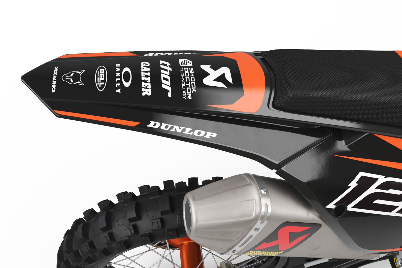 Le kit déco motocross complet pour KTM by OMXGraphics comprend les stickers pour: ouïes / réservoir, plaques latérales, boîte à air, garde-boue arrière, garde-boue avant, plaque numéro avant, protections de fourche et bras oscillant (le contenu peut varier selon le modèle de ta moto).