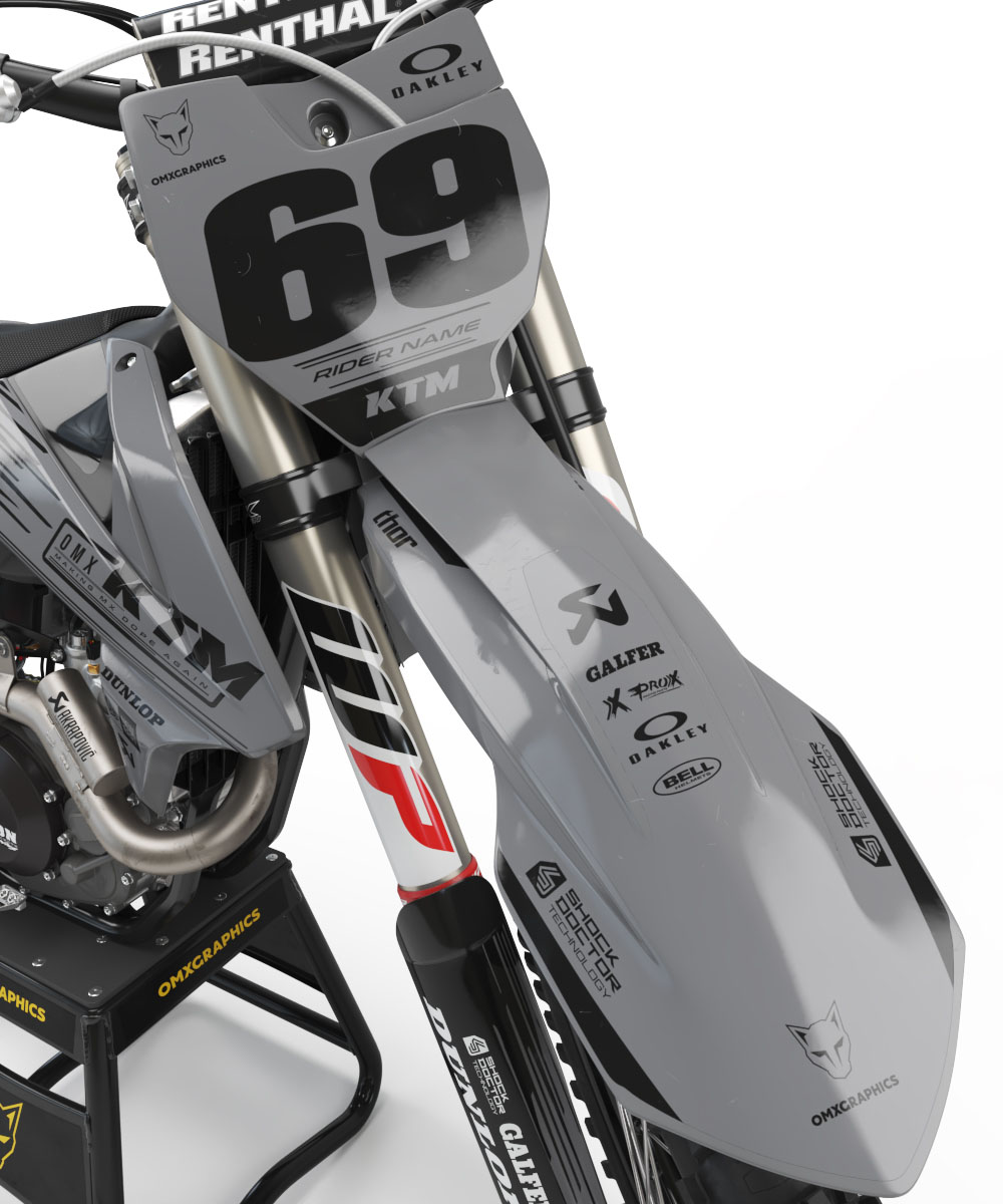 Le kit déco motocross complet pour KTM by OMXGraphics comprend les stickers pour: ouïes / réservoir, plaques latérales, boîte à air, garde-boue arrière, garde-boue avant, plaque numéro avant, protections de fourche et bras oscillant (le contenu peut varier selon le modèle de ta moto).