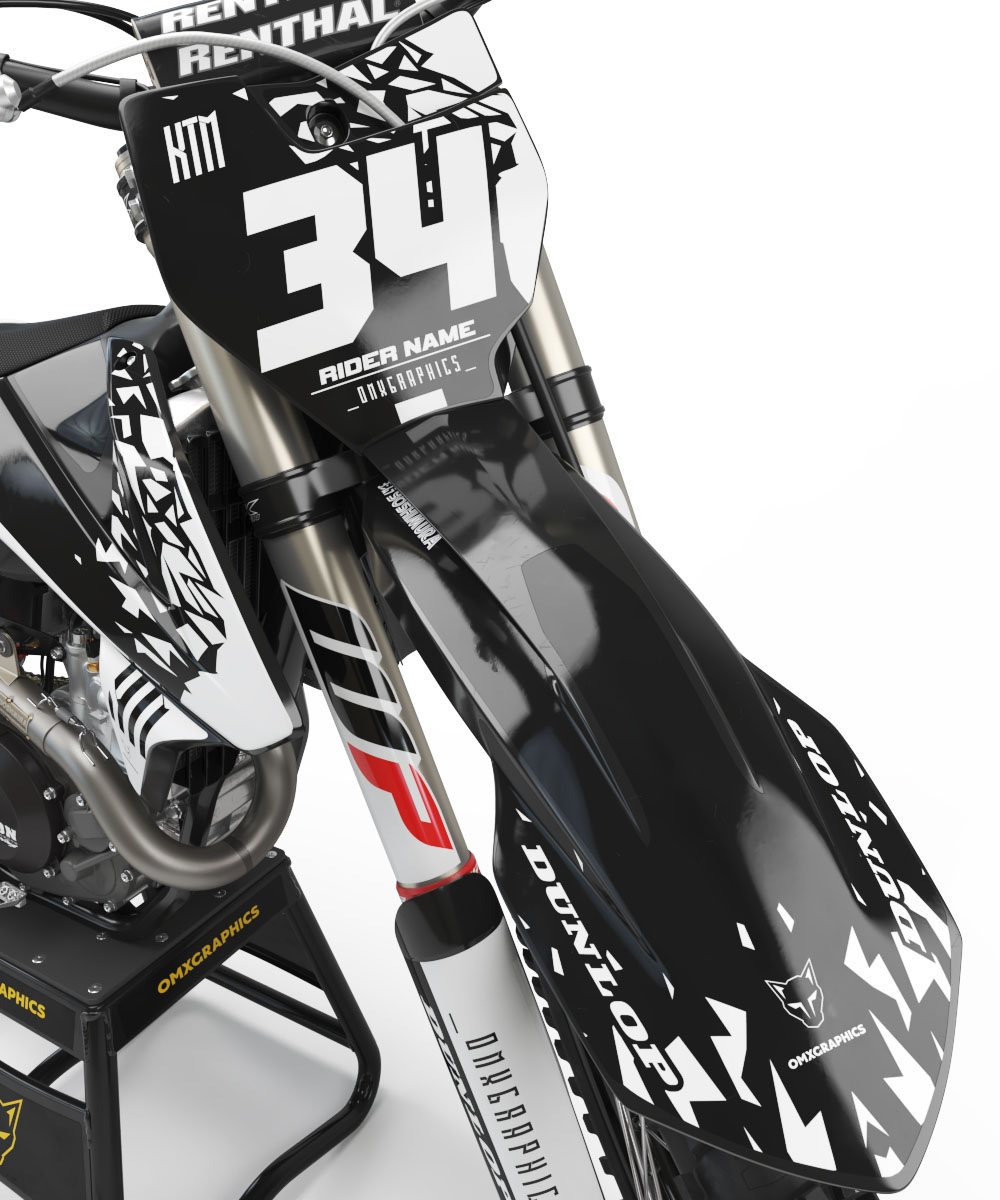 Le kit déco motocross complet pour KTM by OMXGraphics comprend les stickers pour: ouïes / réservoir, plaques latérales, boîte à air, garde-boue arrière, garde-boue avant, plaque numéro avant, protections de fourche et bras oscillant (le contenu peut varier selon le modèle de ta moto).