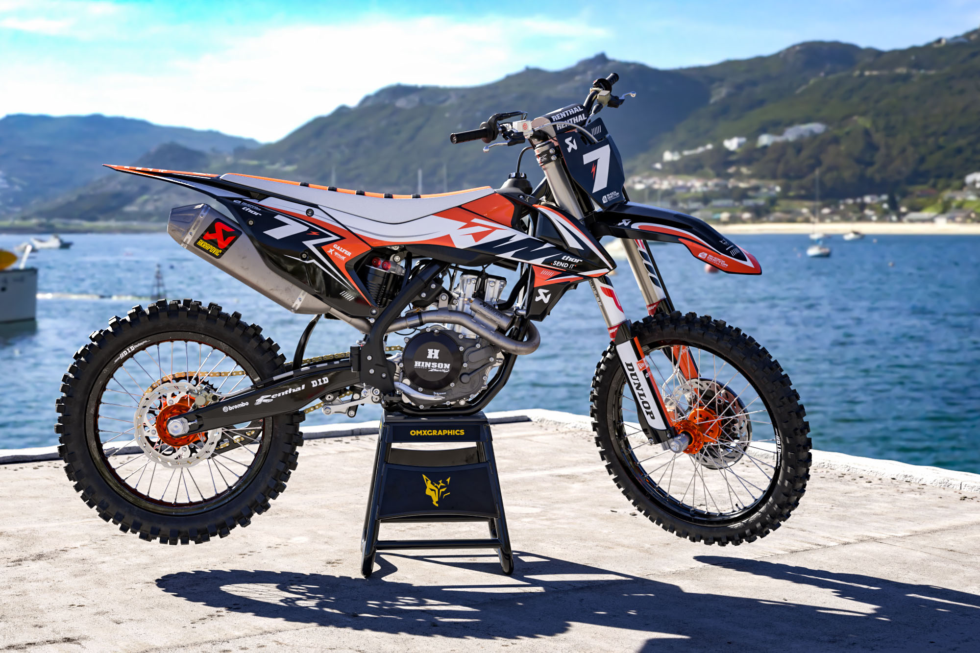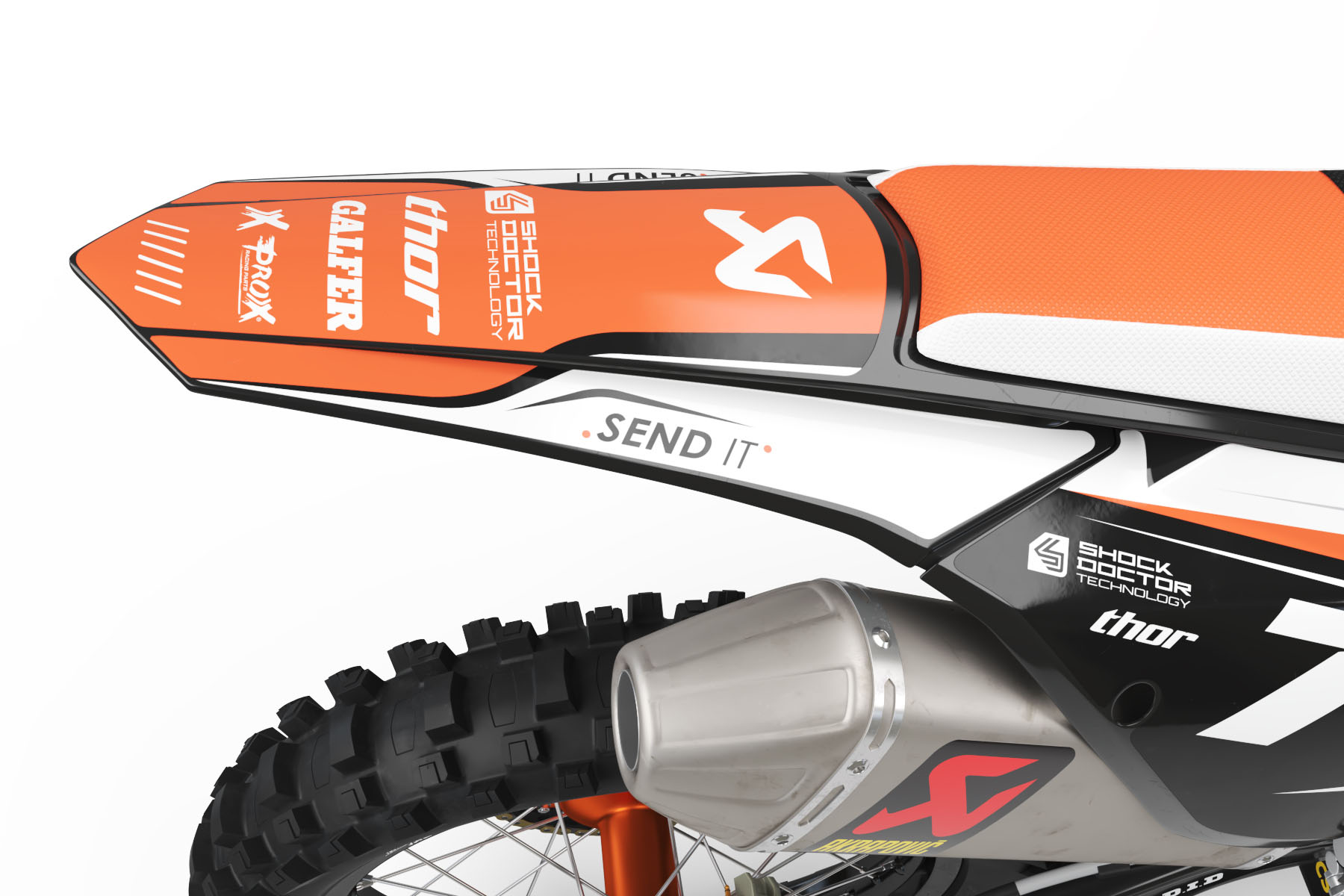 Le kit déco motocross complet pour KTM by OMXGraphics comprend les stickers pour: ouïes / réservoir, plaques latérales, boîte à air, garde-boue arrière, garde-boue avant, plaque numéro avant, protections de fourche et bras oscillant (le contenu peut varier selon le modèle de ta moto).