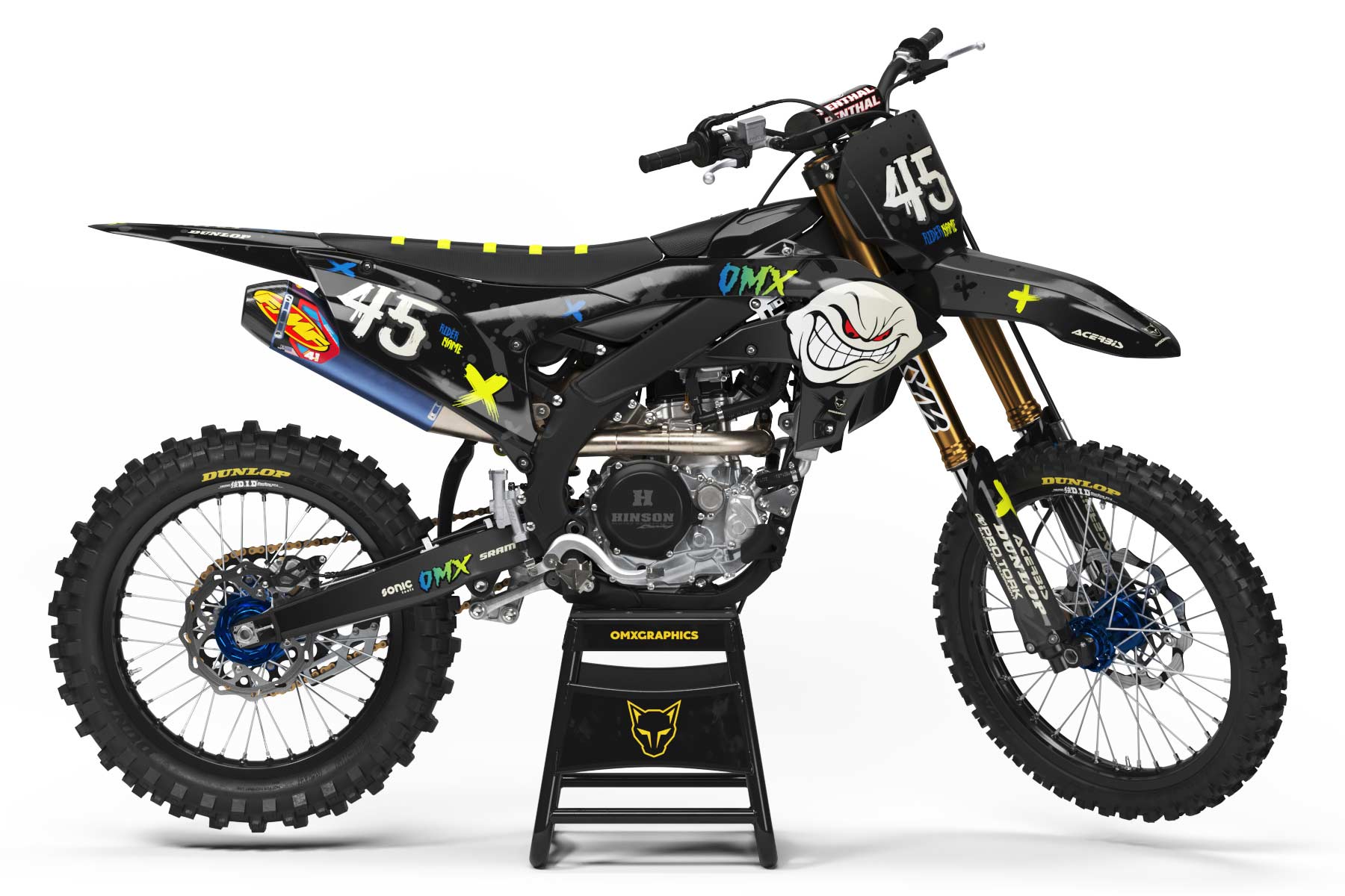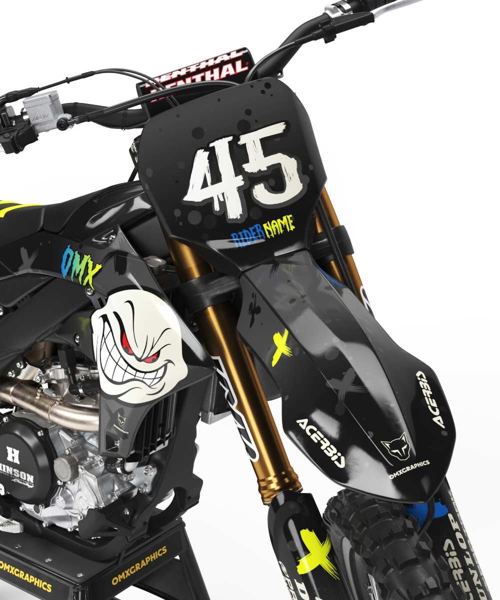 All of our custom graphic kits can be made to fit any make and model! If you don’t find your bike / model on our website, feel free to drop a line and we will figure it out for you! Full graphics kit includes: Radiator shroud set Front and side number plate decals Air box decals Front fender decal Rear fender decal Fork guard decals Swing arm decals Logos: We have most of Motocross industry related logos that can be used on your decals; However there are few logos like energy drink that we cannot use; If you would like to use your own sponsor / company logos you can upload them or send to sales@omxgraphics.com including your order number and name; All logos need to be in vector format (ai. eps. pdf.). If you do not have one of these we will our best to work with your file or make a custom one for you; Our materials All our decals are made using Substance materials only - industry leading print media for motocross and other power-sport applications. Developed alongside worlds best racers and testet in harsh conditions.  FLO Technology eliminates bubbles and massively reduces installation time.  6mil Ultra-Aggressive Print Media with FLO Technology + 15mil Premium Clear Overlaminate All materials are specifically engineered for motocross, karts, ATVs, snowmobiles, side-x-sides, helmets, and other extreme applications requiring exceptional protection, durability, and flexibility.  Turnaround - Most orders are shipped out within 5 - 10 business days after your order date; - Seat covers are shipped separately; - Please allow us 1 - 5 business days for production after your design approval; Here you can find a video on how to easy install your new graphics kit.