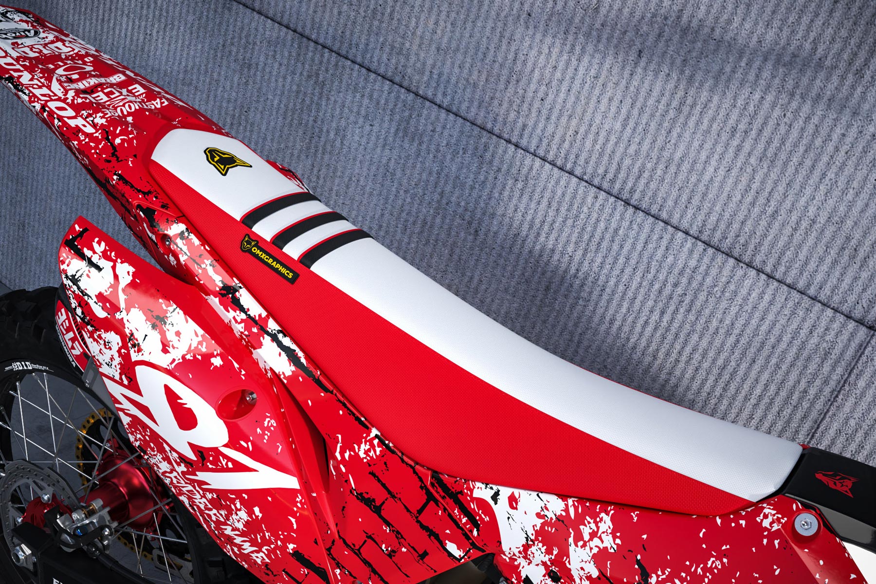 New motocross season calls for some fresh updates, right? Of course, updating a ride with a custom graphics kit is cool. In addition, it is even cooler when the decals come from OMX. But hey – everybody already does that. OMX Graphics makes not only the finest graphics on planet Earth, but also top quality mx seat covers. And yes, they can be customisable to match your dirt bike perfectly. Our seat covers will feature quite a few grip options: solid, two tone, rib grip, three rib, and full grip. That allows you to maintain the perfect riding position rather than slipping on the seat in wet or dry conditions.
